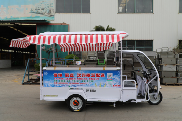 | 專用設(shè)施 | 整車匹配全封閉頂棚,左右側(cè)和尾部配備開開啟式門,門開啟后可用作遮陽使用,頂棚內(nèi)部配有LED照明燈;整車配有4000W逆變器供冰箱用電 | ||